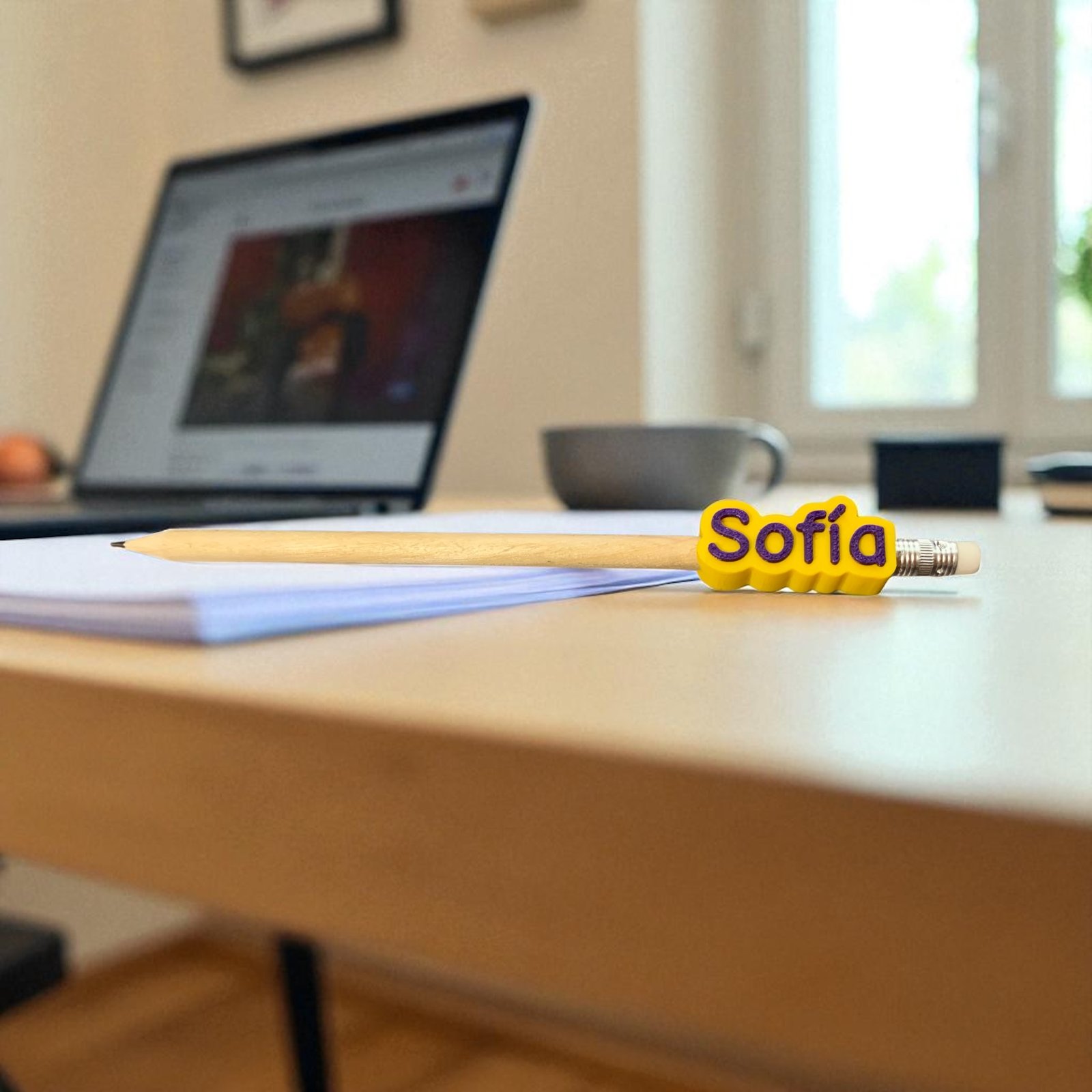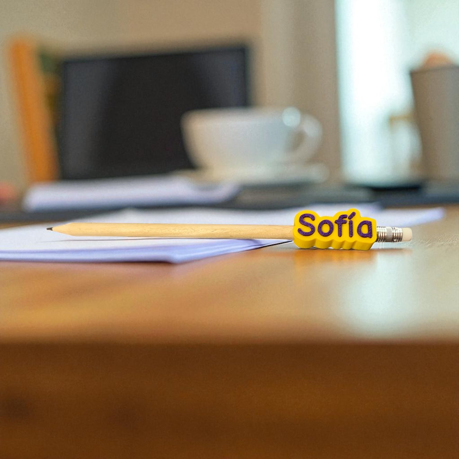• Incluye: 1 lápiz de madera con goma + 1 topper con el nombre montado.