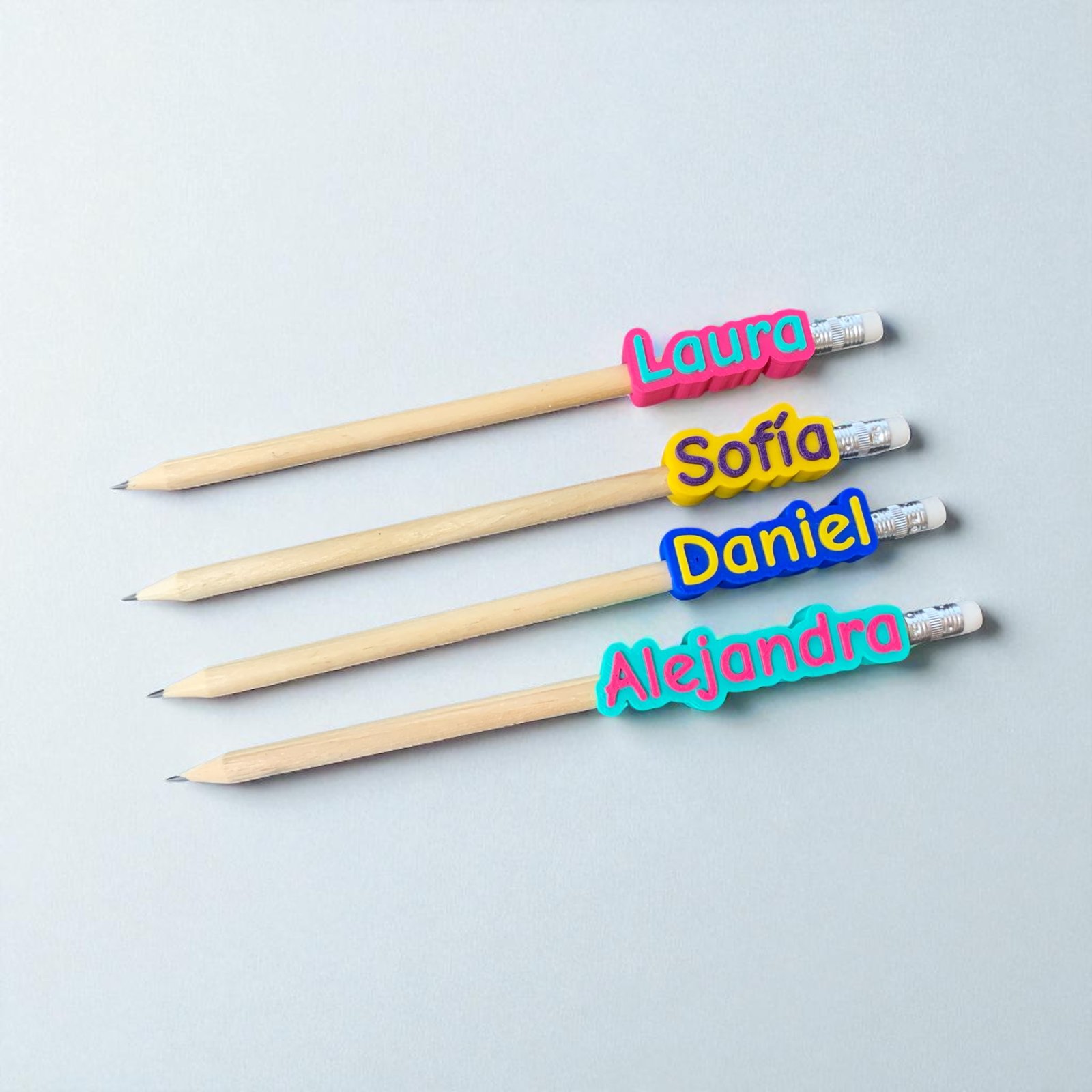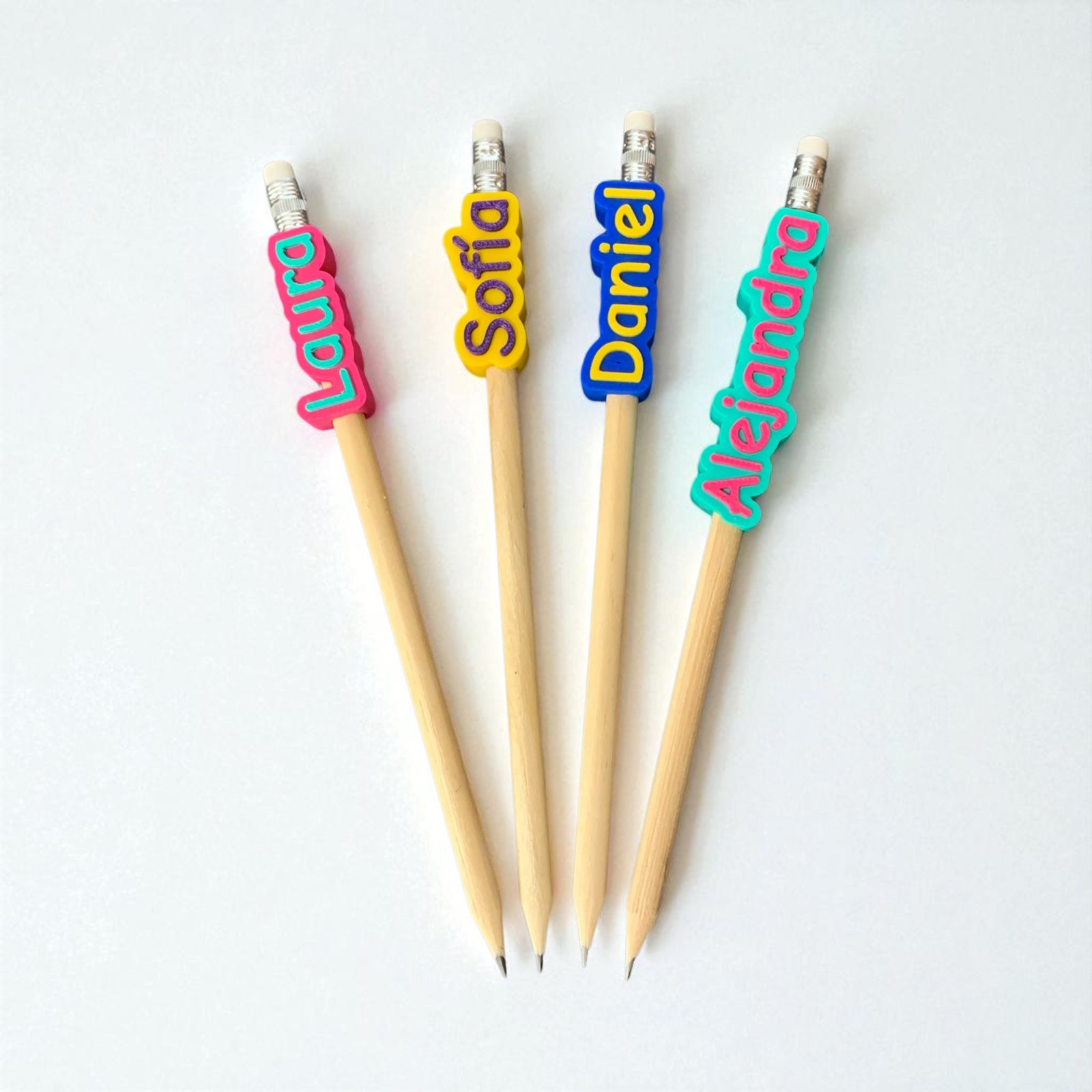 Porque lo suyo es que su material hable de ellos. Nuestro lápiz personalizado con nombre lleva un topper en 3D, bicolor y con letras en relieve, para identificarlo al instante y darle ese toque único que tanto nos gusta. Se vende el conjunto completo (lápiz + topper), pero el topper puede quitarse y ponerse en otros lápices redondos que tengas en casa.